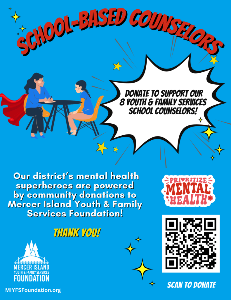 All year long (with a focus each Fall), we connect with parents/caregivers and other community members to raise essential funds to support the YFS School-Based Counselors. Please consider donating to ensure that we can keep this vital mental health resource in each Mercer Island school. Thank you!
